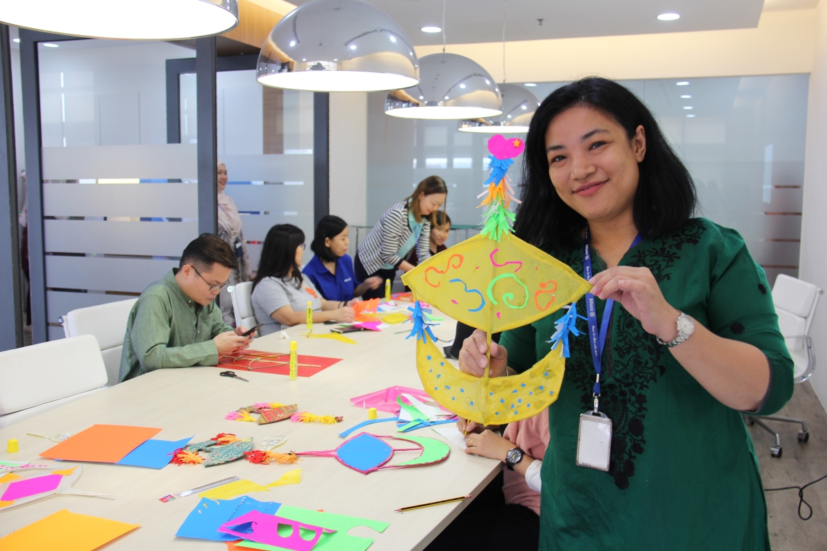 An employee holds a Wau, or moon-kite as part of Malaysia Day 2017 activities at Menara Allianz.