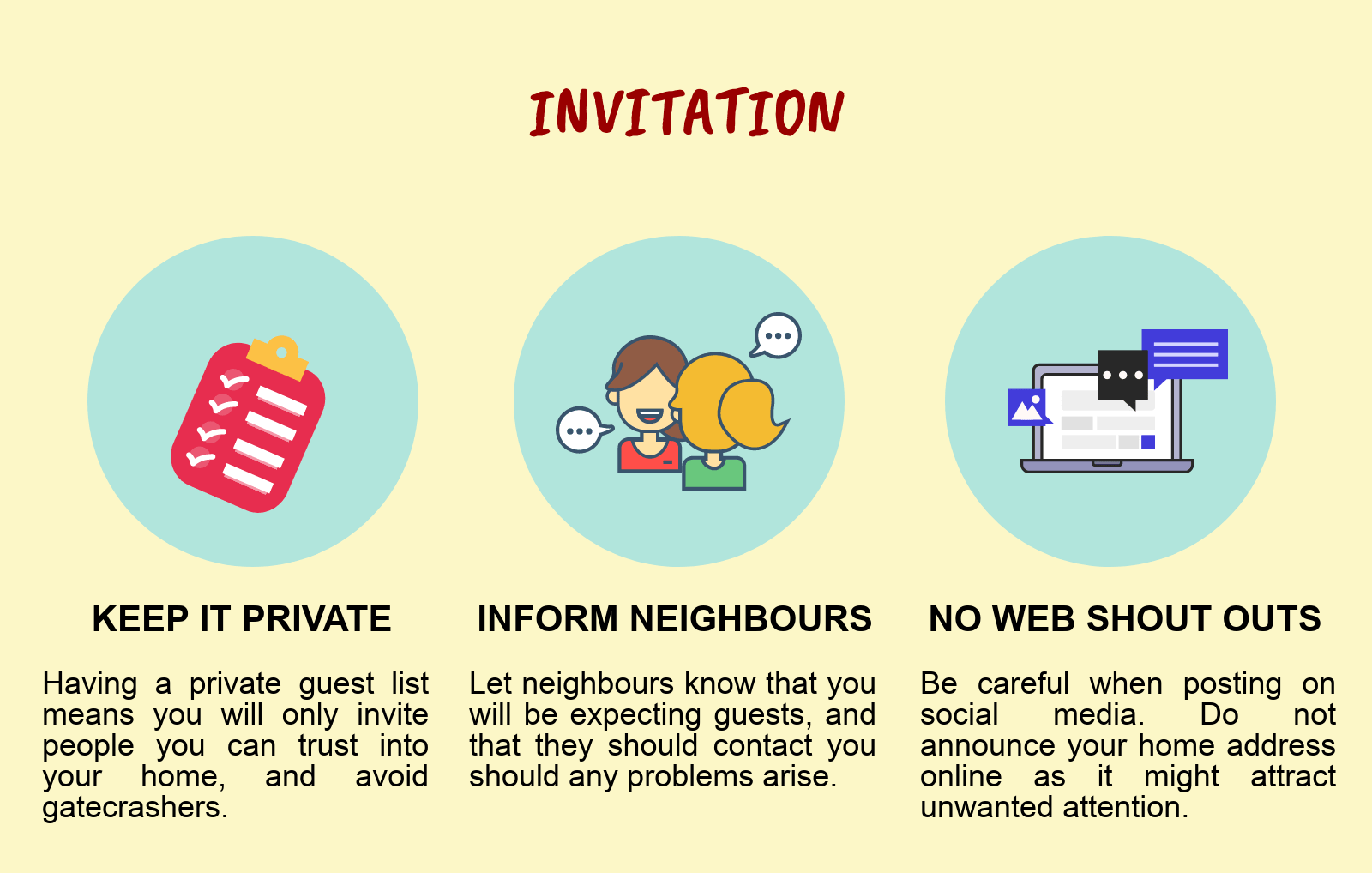 Here are some tips to help you ensure your home is protected, ranging from the precautions you should take when inviting friends, to preparing for the day, and what you should do during your house party.