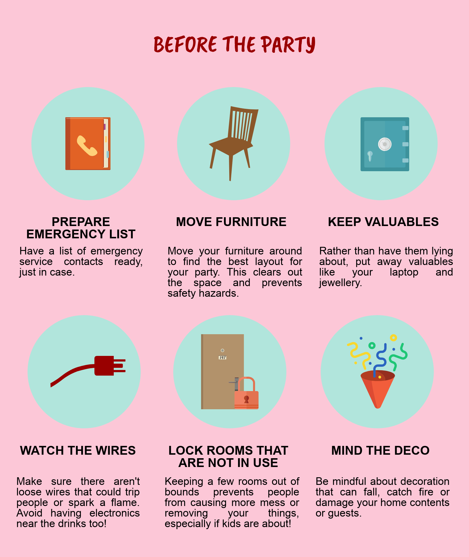 Hosting a party at home can be fun, but is no easy task. It requires plenty of coordination and planning, especially when you are expecting a large number of guests. There are many considerations you need to take to make sure that your guests remain safe during the house party, and even more to ensure that your property is also safeguarded from unsuspecting invaders and “guests”. The last thing you would want to remember after your party is what you lost if you haven’t been careful!