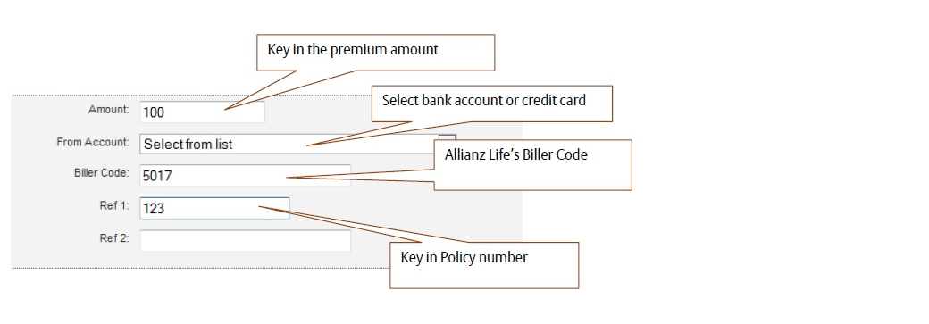 Allianz Life’s biller code is 5017. You could find it in your premium due / reminder notice that has been send to you. Please note that ONLY policy number that met our validation rule is allowed to make premium payment via JomPAY.