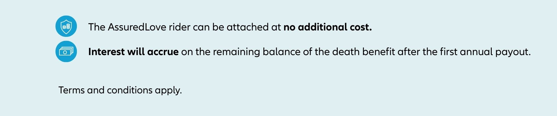 With AssuredLove, your life policy goes beyond protection and becomes a lasting expression of love, continuous guidance and financial support for your loved ones for years to come.