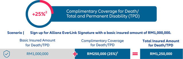 2. The Complimentary Coverage for Death/TPD is equivalent to 25% of the basic insured amount, capped at RM500,000 per life.