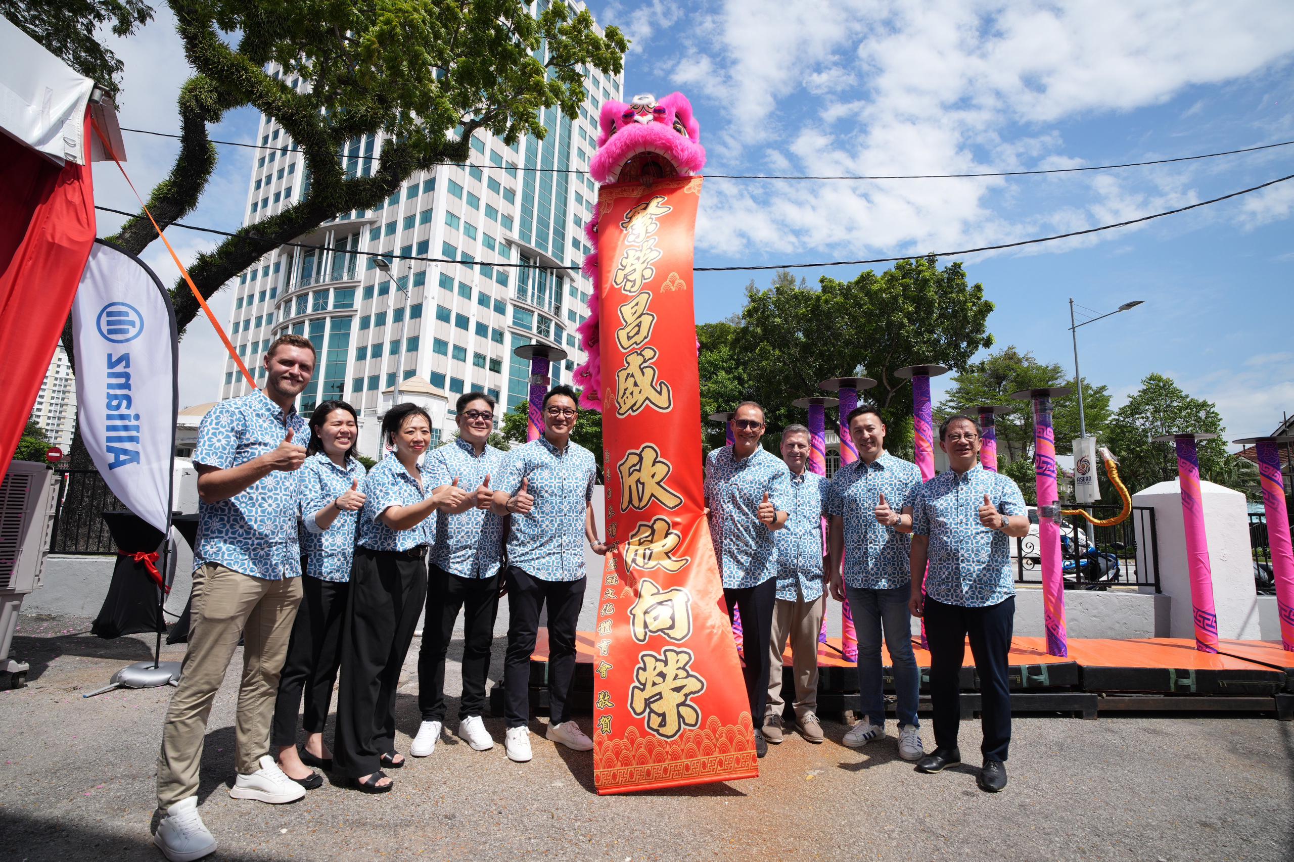 Allianz Malaysia Chief Executive Officer, Sean Wang (5th from left); Allianz Life Insurance Malaysia Berhad Chief Executive Officer, Charles Ong (extreme right) and Allianz Malaysia Chief Financial Officer Giulio Slavich (4th from right) with senior management of Allianz Malaysia Berhad posing with words of encouragement and for business to thrive and prosper for the branch with the lion.