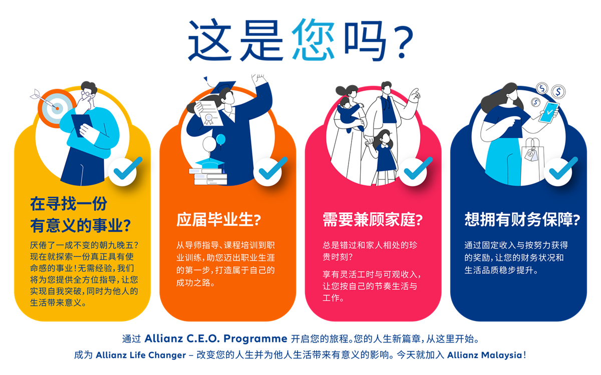加入我们,成为 Allianz Life Changer—— 掌握您的人生旅程,同时帮助他人打造有意义的人生!
